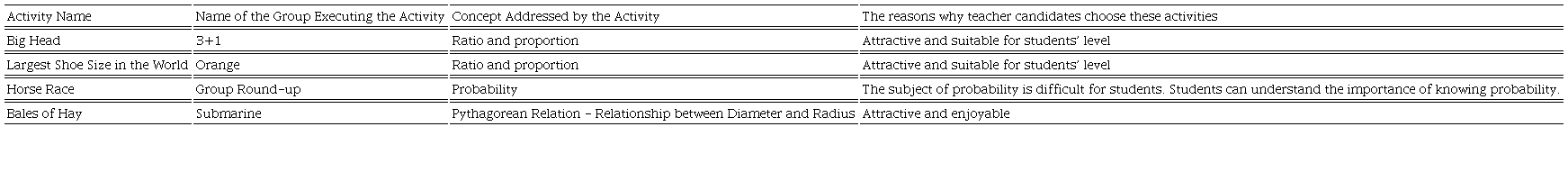 Generally, pre-service teachers stated that they paid attention to the fact that the activities were easy and interesting because the students were not accustomed to such activities. They thought that it would be fun for students to compare their own body measurements in activities related to ratio-proportion. In the activity related to probability, they reported that the students had difficulties in probability, so they chose an activity that explained the importance of knowing probability.