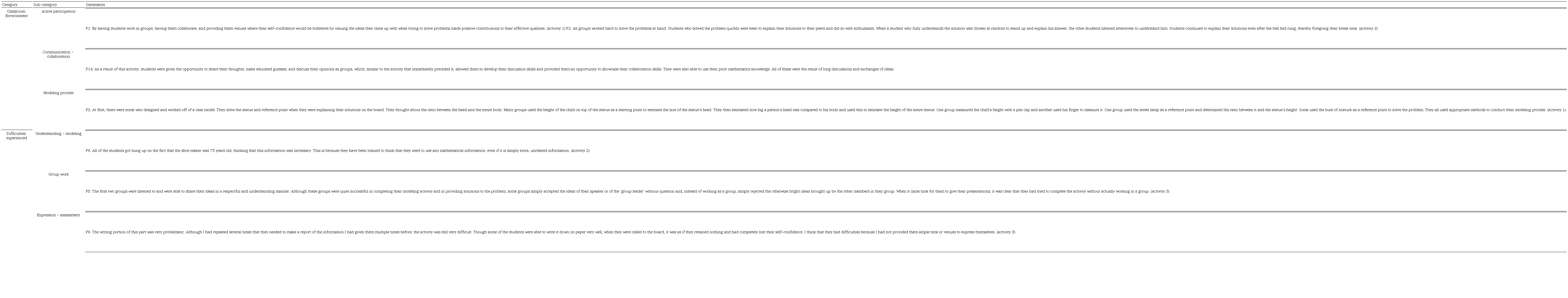 The data generated from this study were subject to content analysis. After watching the video recordings of activities, all the observation notes made by PTs were collected and transferred to a qualitative data analysis program. Then, all statements were coded and appropriate categories were made. These categories were themselves grouped under two headings, namely Activity-Student-Teacher and Preservice Teachers. Table III depicts a short section of the data analyzed. The themes addressed by PTs were divided into various categories and subcategories. Specifically, the subcategories included under the category Classroom Environment were: (i) active participation, (ii) communication-collaboration, and (iii) modeling process whereas the subcategories included under the category Difficulties Experienced were: (i) understanding-modeling, (ii) group work, and (iii) expression-assessment.