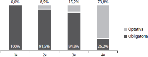 En cuanto a la distribución de créditos por curso y carácter de la materia (Figura 1), teniendo en cuenta el diseño de los planes de estudio, la mayor carga de créditos obligatorios está en los dos primeros cursos (1º y 2º), concentrándose mayoritariamente la oferta optativa en 3º y 4º curso. Si bien, hay universidades que ofrecen esta formación ya desde 2º curso, y la obligatoriedad se extiende entre los cuatro cursos, siendo su concentración mayor en 1º, 2º y 3º.