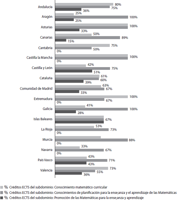 En lo que respecta a la tercera pregunta que nos hemos planteado, seis comunidades autónomas no desarrollan el subdominio Promoción de las matemáticas para la enseñanza y el aprendizaje, siendo únicamente en la comunidad autónoma de las Islas Baleares donde existe un equilibrio entre los tres subdominios. Es destacable una cierta variabilidad en el porcentaje de los otros dos subdominios (Conocimiento matemático curricular y Conocimientos de planificación para la enseñanza y el aprendizaje de las matemáticas), siendo el segundo el de mayor presencia en la mayoría de las comunidades autónomas (Figura 10).
