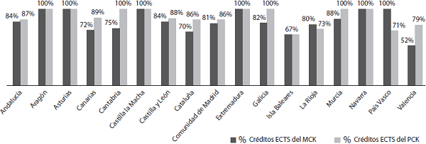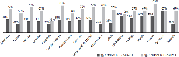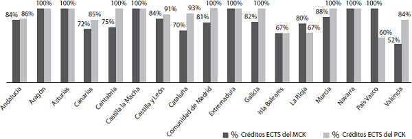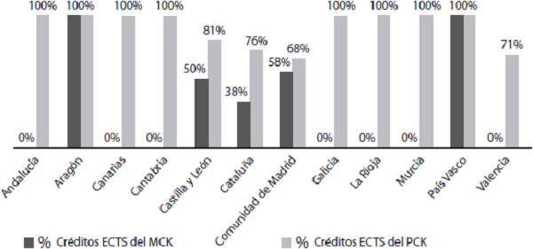 En particular, si analizamos esta situación comparando la oferta obligatoria de créditos y la optativa se puede observar que en seis comunidades autónomas los conocimientos PCK y MCK están igualmente presentes en la oferta obligatoria, y cuando esta situación de igualdad no se da, predomina el MCK (Figura 3).