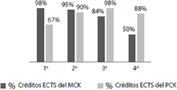 Esta cuestión que puede parecer a simple vista una obviedad, por ser un consenso entre universidades, puede tener efectos en la distribución del peso otorgado al PCK y al MCK en la formación. De esta manera, en relación a la primera pregunta de nuestra investigación, nuestros resultados afirman que el MCK domina en la formación obligatoria, mientras que el PCK tiene una mayor presencia en la optatividad. Esta realidad puede inferir lo expuesto en el estudio de Anderson y Kim (2003), previamente es necesario afianzar el dominio de la disciplina para poder enseñarla posteriormente, y, por tanto, podría decirse que los planes de estudio se elaboran desde este supuesto.