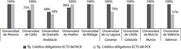 Como podemos ver en la Tabla II hay nueve universidades con una oferta de formación matemática obligatoria con un número mayor o igual a veinte ECTS. Se puede observar que el MCK es igual o predominante con respecto al PCK, excepto en un caso (Figura 6).