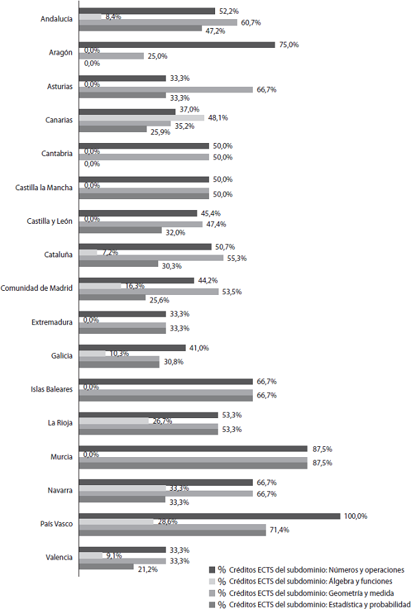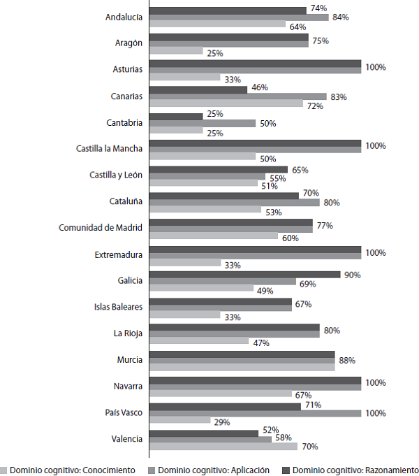 Si analizamos los subdominios del dominio del contenido del MCK se puede observar que el de Números y operaciones es el dominante en Aragón, Galicia y País Vasco; mientras que el de Geometría y medida tiene mayor presencia en Andalucía, Asturias, Castilla y León, Cataluña y Comunidad de Madrid. Es destacable también que Canarias presente el subdominio de Algebra y funciones como el predominante, siendo éste el minoritario en el resto de las comunidades autónomas. También se puede observar que Castilla la Mancha, Extremadura, Islas Baleares y Murcia, presentan el mismo peso porcentual en los tres subdominios que tienen y Cantabria en sus dos subdominos (Figura 9).
