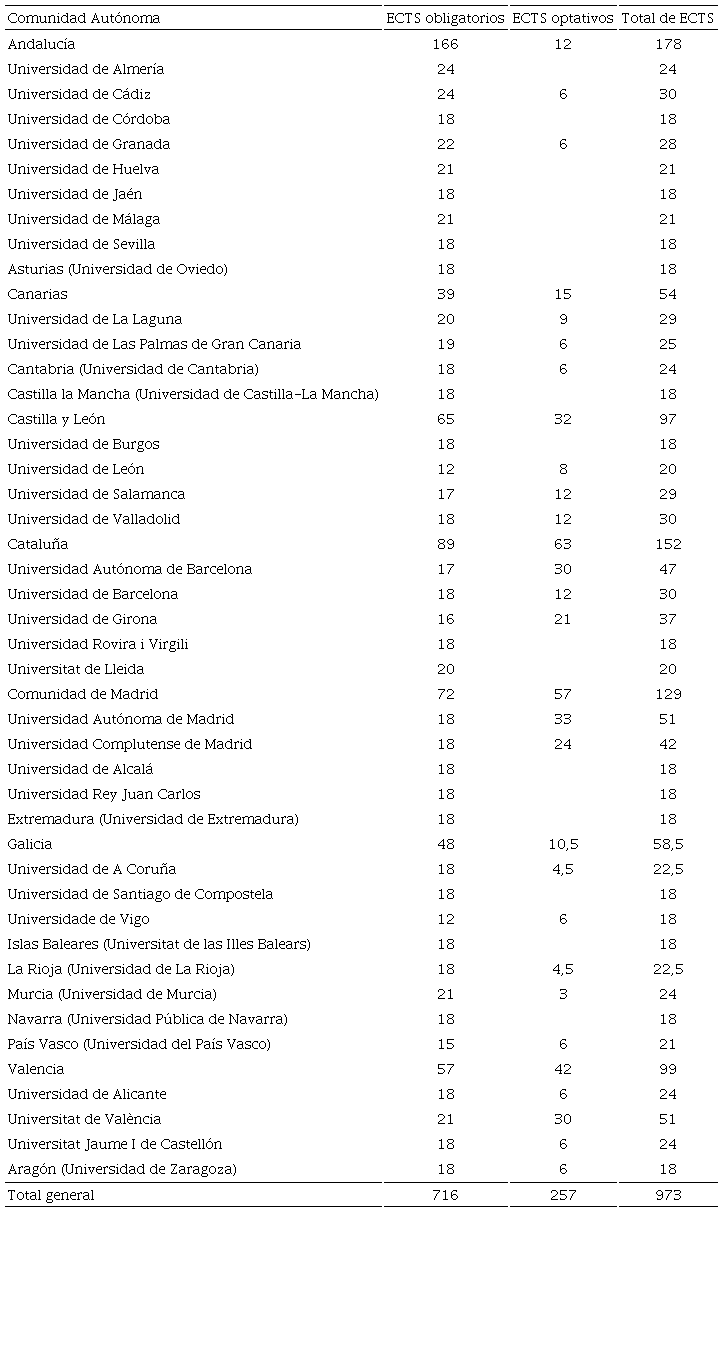 La distribución de asignaturas y créditos en estos títulos sería de 240 ECTS totales, distribuidos en 180 correspondientes a la formación básica y 60 destinados a la formación adicional de orientación académica o profesional (Tabla I).