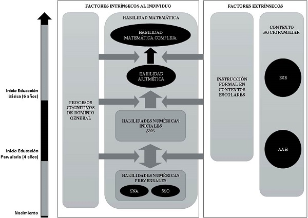 Más allá de los factores intrínsecos que determinan el desarrollo de la habilidad numérica, la influencia de factores extrínsecos es imprescindible para lograr los principales hitos que nos llevarán al éxito en el área matemática. Estos factores extrínsecos se pueden dividir en la instrucción o entrenamiento formal de la habilidad numérica y aritmética, por una parte, y en la influencia que ejerce la diversidad de contextos no formales, donde destaca el ambiente familiar, determinado por el estatus socioeconómico de las familias y el ambiente de aprendizaje en el hogar.