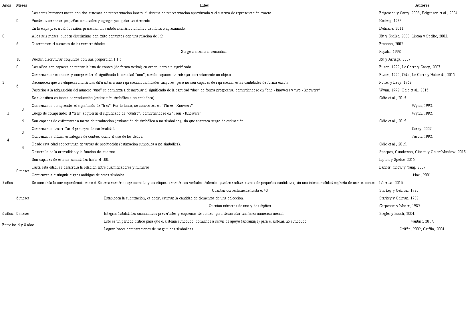 El desarrollo de estas habilidades nos va a permitir identificar, comprender, ordenar y operar con los símbolos numéricos arábigos, es decir, dominar el concepto del número, paso previo a al cálculo operatorio simbólico. En la Tabla 1 se muestran una serie de hitos, donde interactúan factores intrínsecos y extrínsecos al individuo, y que son necesarios para la adquisición del sistema numérico simbólico.