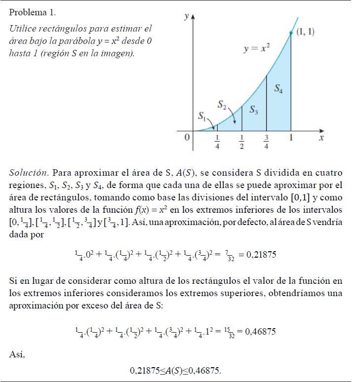 Para facilitar la comprensión de esta definición general es necesario planificar en la enseñanza un significado más intuitivo, como el que se pone en juego en el problema 2. Se trata de ejemplificar las sumas de Riemann y el paso al límite para determinar el valor al que tiende la suma de áreas de rectángulos bajo la gráfica de en el intervalo [0,1] (Figura 3).