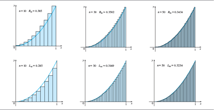 Argumentos: Si todos los rectángulos quedan debajo de la gráfica de la función obtenemos una aproximación por defecto y si la curva queda por debajo de la altura de los rectángulos, la aproximación será por exceso.