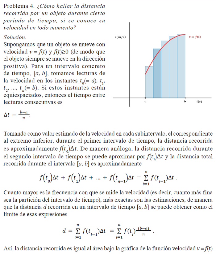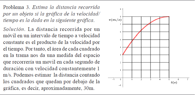 Permite conectar el cálculo de la distancia con el área bajo la curva velocidad en función del tiempo2. La búsqueda del cálculo exacto de la distancia recorrida por un objeto en un intervalo determinado de tiempo conocida su velocidad en función del tiempo (Figura 5), pone en juego el cálculo de límite de sumas de Riemann, lo que supone un grado mayor de formalización.