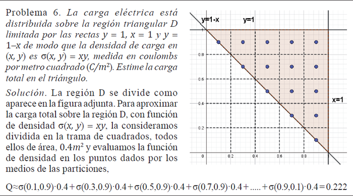 La solución al problema 6 supone un primer acercamiento intuitivo a la integral doble, como límite de sumas de Riemann donde la función involucrada tiene dos variables, en este caso la densidad de carga en cada punto de la región. Intervienen los siguientes objetos matemáticos: