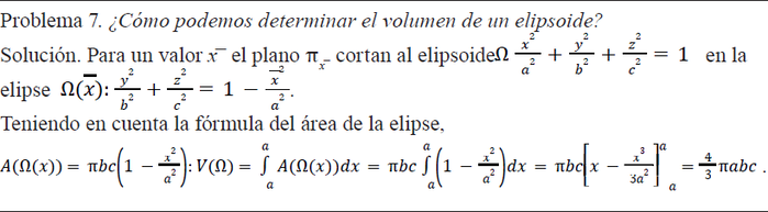 En la determinación del volumen de un elipsoide genérico incluida en la Figura 8, intervienen objetos de una elevada complejidad semiótica: familias de ecuaciones descritas por medio de parámetros (elipsoides y elipses obtenidas como cortes con los planos). Además, se opera con variables y parámetros (fórmula del área de las elipses obtenidas al seccionar el elipsoide y determinación del volumen como integral de las funciones área) por lo que el nivel de algebrización en la solución descrita es 5.