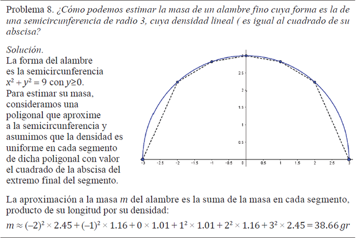 La solución al problema 8 es contiene un acercamiento intuitivo y formal a la integral de línea, como aproximación de sumas de Riemann y en función de una integral simple, donde la densidad lineal depende de dos variables, en cada punto de la curva. Intervienen los siguientes objetos matemáticos: