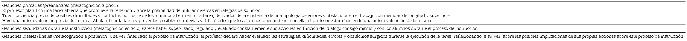 A pesar de que el profesor declara no haber incluido en sus objetivos, de forma explícita, el desarrollo de conocimientos metacognitivos en sus alumno(a)s, lleva a cabo determinadas acciones, brindando apoyo y orientaciones encaminadas a lograr el objetivo de la tarea (conseguir que los estudiantes pongan en práctica estrategias adecuadas para la resolución del problema), proporcionando condiciones óptimas para emergencia de procesos y estratégias metacognitivas en sus alumnos conforme han mencionado diferentes estudios (Schraw y Gutierrez, 2015; Díaz et al., 2017; Balderas et al., 2020). Así, las acciones del profesor activan decisiones de gestión (planificación, supervisión/control, regulación, revisión/evaluación) que deben ser consideradas como acciones “a priori”, cuando diseña la tarea; “en acto”, cuando se trata del momento de la realización de la práctica en clase con sus alumnos; y “a posteriori”, cuando se trata de evaluar su propia práctica (auto-evaluación) y la práctica de sus alumno(a)s. Se trata de gestiones en las que se ponen en juego sus conocimientos metacognitivos y podrían ser descriptos de la siguiente forma: