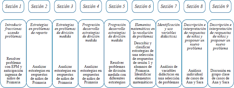 El experimento de enseñanza diseñado en la asignatura Matemáticas y su Didáctica II constaba de nueve sesiones de dos horas cada una (Figura 1) y tenía como objetivo que los EPM aprendieran a usar información sobre la progresión de las estrategias en la resolución de problemas de división-medida con fracciones para anticipar respuestas de los alumnos.