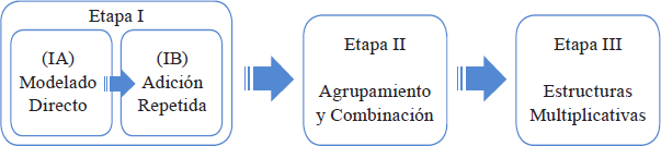 La información proporcionada sobre la progresión en las estrategias usadas por los estudiantes para resolver los problemas de división-medida con fracciones (Empson y Levi, 2011) consta de tres etapas. En las dos primeras (I y II) se utilizan estrategias aditivas y en la tercera (III) estrategias multiplicativas (Figura 2).