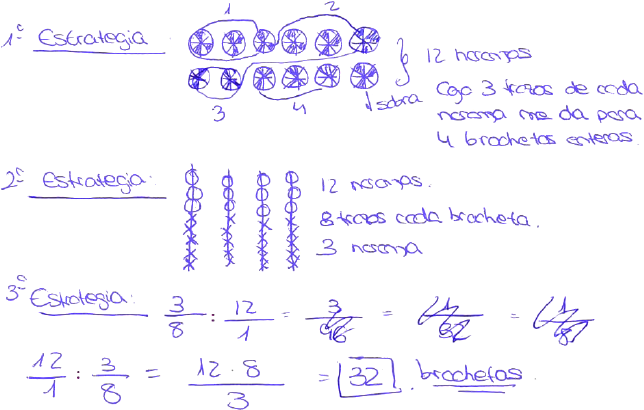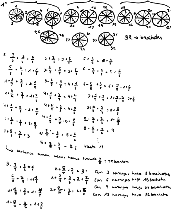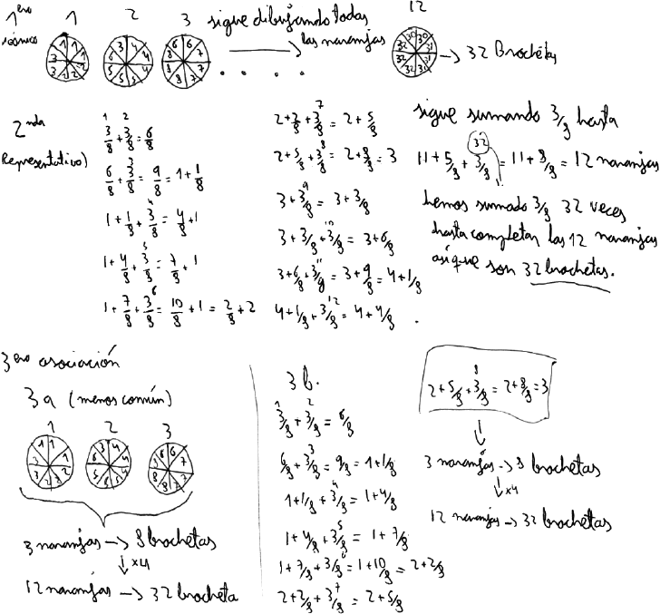 Por ejemplo, en el problema de las brochetas agrupan 8 unidades fraccionarias (3/8), 3/8 + 3/8 + 3/8 + 3/8+ 3/8 + 3/8 + 3/8 + 3/8 para obtener 3 naranjas que sirven para hacer 8 brochetas. Los niños repiten este proceso de agrupamiento cuatro veces más (hasta 12 naranjas), tendremos para hacer 32 brochetas.