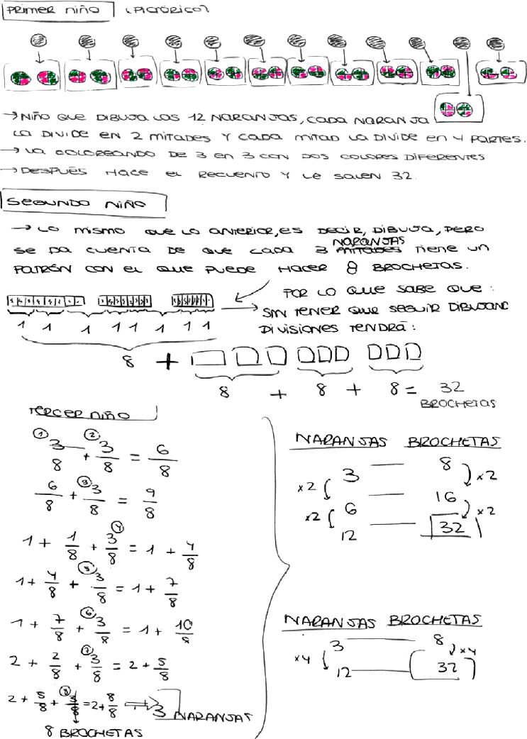Por ejemplo, la EPM-41 anticipa una estrategia de modelización directa y, a partir de ella, después de dividir tres rectángulos en octavos y observar “que de cada tres naranjas tiene un patrón con el que puede hacer ocho brochetas”, presenta otra estrategia abandonando la modelización directa y describiendo una estrategia de agrupamiento-combinación, dibujando y sumando grupos de naranjas y de brochetas. Por último, partiendo de una estrategia de adición repetida, después de sumar y contar la fracción 3/8 reiteradamente, y observar que con 3 naranjas se hacen 8 brochetas, presenta una estrategia de adición repetida y anticipa estrategias multiplicativas por un proceso constructivo y por multiplicación (Figura 6).