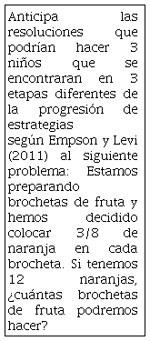 Durante las sesiones 2 a 8, se les proporcionó información sobre las características de los problemas de división-medida y sobre la progresión en las estrategias usadas por los niños (Empson y Levi, 2011). La información proporcionada tenía por objetivo que los EPM mirasen de forma estructurada las características de los problemas de división con fracciones y las posibles respuestas de los estudiantes. Es decir, aprendieran a identificar las estrategias que los estudiantes usaban en estos problemas, interpretar la etapa de progresión en el uso de estas estrategias y decidir qué hacer para apoyar la progresión del aprendizaje de los estudiantes. En síntesis, se buscaba que los EPM profundizaran en la progresión de aprendizaje de este tipo de problemas como un aprendizaje con significado del algoritmo de la división de fracciones, a través de estrategias cada vez más complejas.