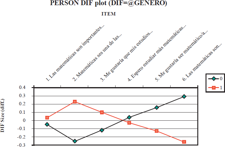 El análisis de funcionamiento diferencial de los ítems (DIF) por sexo (0= hombres; 1= mujeres) no arrojó diferencias importantes en la mayoría de las escalas. La única escala que aparece con un DIF de sexo marginal es la de la disposición hacia las matemáticas, donde 2 ítemes (“las matemáticas son importantes para mi futuro” y “las matemáticas son importantes para mi futuro después del colegio”) muestran magnitudes de DIF del rango de 0.5 logits. Sin embargo, dado que apuntan en direcciones opuestas no fueron consideradas como amenazas de sesgo para la escala completa (ver Figura 1).