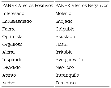 En cuanto a la experiencia emocional de los estudiantes durante el ejercicio de las matemáticas se investigaron 2 componentes generales dominantes de la experiencia emocional, etiquetados típicamente como afectos positivos y afectos negativos. Para medir estos factores, Watson et al. (1988) desarrollaron la escala de afectos positivos y negativos (PANAS), que consiste en 2 escalas de 10 ítemes cada una (ver Tabla I). A los participantes se les pide que califiquen cuando experimentan distintas emociones expresadas en 10 palabras (por ejemplo: interesado, orgulloso, irritable, hostil, etc.) indicando el grado en el que sienten cada una de ellas durante el quehacer matemático según una escala de 5 puntos (desde muy leve a muchísimo). El instrumento ha sido validado en este formato, mostrando a través de análisis factorial confirmatorio que el modelo más adecuado (robust comparative fit index = .94) consiste en dos factores correlacionados (ver Crawford y Henry, 2004) que aparecen de forma consistente en distintas culturas, formatos de respuesta y lenguas, incluyendo el español (Dufey y Fernandez, 2012; Moriondo et al., 2012; Robles y Paez, 2003).