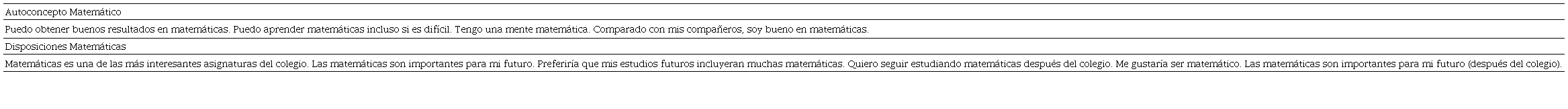 Un segundo constructo que se considera en este estudio es el autoconcepto hacia las matemáticas, que se refiere a la asociación de las matemáticas con una/o misma/o o el verse a una/o misma/o como “buena/o” o “malo/a” en matemáticas (Cvencek et al., 2011; Darragh, 2015; Mendick, 2005). Estás creencias o juicios sobre una/o misma/o en comparación con otras personas y consigo mismo (Parker et al., 2014) tienen una fuerte relación tanto con rendimiento como con aspectos motivacionales, tanto en estudios internacionales (Marsh, 1990; Marsh, 2007; Marsh et.al., 2008; Valentine et al., 2004) como en Chile (Espinoza y Taut, 2020)