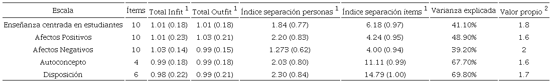 Usando el análisis Rasch para las distintas mediciones construidas permite verificar la validez de utilizar medidas unidimensionales para las escalas de percepción sobre las prácticas de enseñanza centradas en estudiantes, afectos positivos, autoconcepto y disposición hacia las matemáticas utilizando los criterios definidos: estas cuatro escalas muestran indicadores de confiabilidad adecuados (separación de ítemes y confiabilidad de personas), sin ítemes que no se ajusten al modelo y sin antecedentes que indiquen la existencia de más dimensiones (Ver Tabla IV).