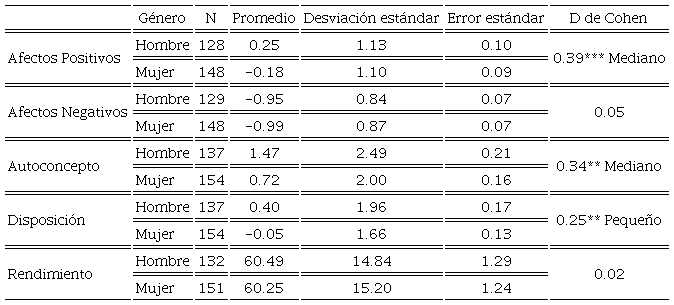 Comparadas con los hombres, encontramos que las estudiantes perciben la enseñanza centrada en el estudiante como menos frecuente, se sienten menos positivas, reflejan niveles inferiores de autoconcepto y tienen una menor disposición hacía las matemáticas en el futuro (ver Tabla V). Todas las diferencias fueron significativas a p= .05, excepto el rendimiento y afectos negativos. Usando el estadístico D de Cohen, la magnitud de las diferencias para los efectos significativos varía de pequeña a media (en un rango de 0.24 a 0.39).