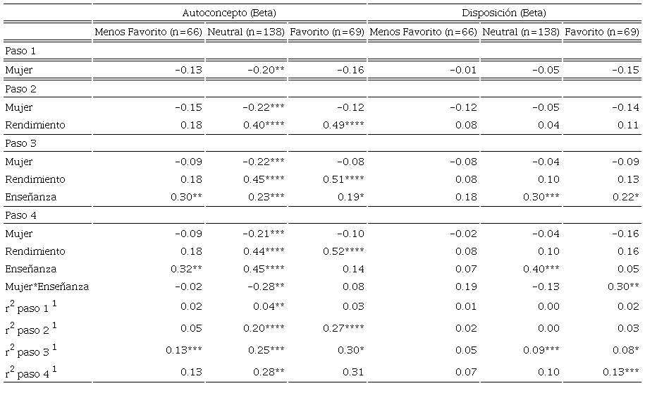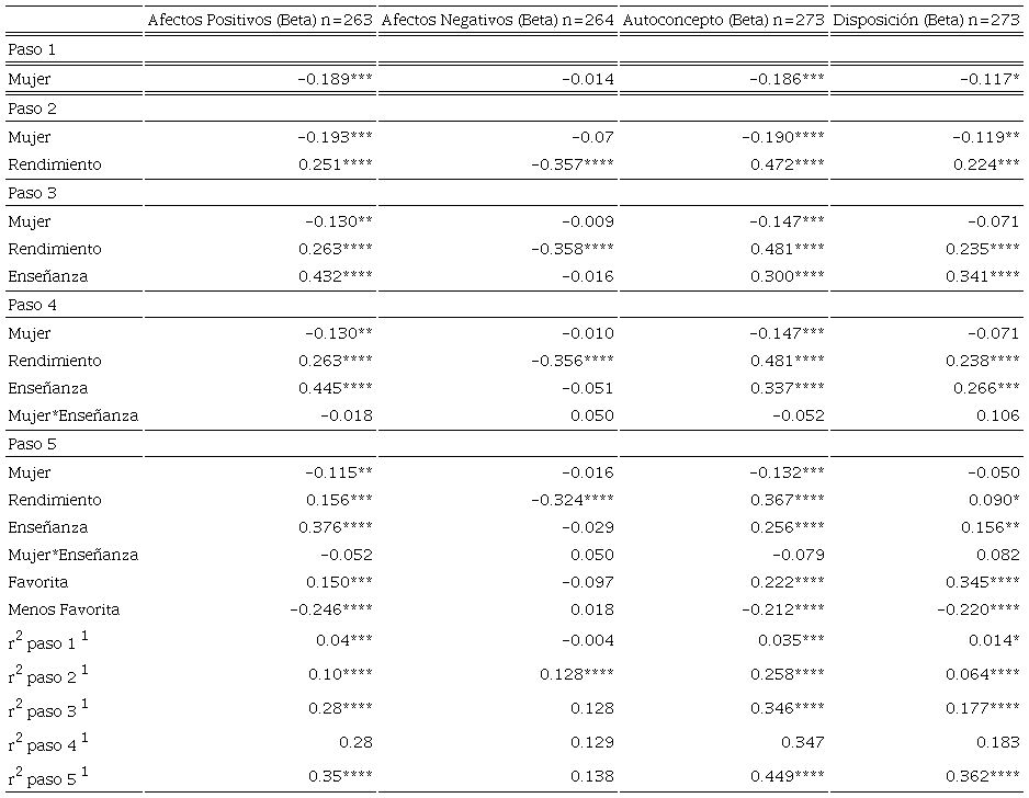 En el paso siguiente (paso 4) la inclusión de la interacción entre sexo y enseñanza percibida no produjo un aumento significativo en la varianza explicada en ninguna de las variables de identificación (modelo de afectos positivos ΔR2= .00, F(1, 258)= 0.06, p= .81; , modelo de afectos negativos Δr2= .00, F(1, 259)= 0.37, p= .54; modelo autoconcepto Δr2= .00, F(1, 268)= 0.55, p= .46; modelo de disposición Δr2= .01, F(1, 268)= 1.84, p= .18). Esto sugiere que el efecto de la enseñanza centrada en estudiantes es el mismo para niñas y niños, lo cual no permite sostener la existencia de un efecto diferencial por sexo (Ver Tabla VI, paso 4).