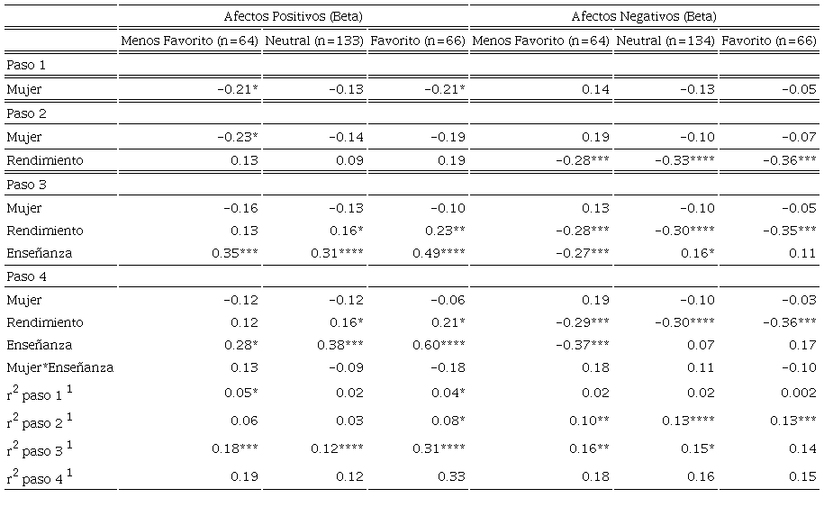 Finalmente, en el paso 5 la inclusión de preferencias demuestra el efecto dominante de esta variable en el modelo. Como se ve en todos los modelos excepto en los de afectos negativos, las variables “favorita” y “menos favorita” se relacionan de forma considerable con las variables dependientes y disminuyen el efecto de la variable de enseñanza (ver pasos 4 y 5), por lo que se hipotetizó que la preferencia podría determinar el efecto de las otras variables en este modelo. Por esto los 4 modelos fueron aplicados de forma separada para cada uno de los 3 subgrupos de estudiantes según su preferencia por las matemáticas.