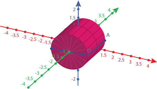 Os eixos x e y são eixos de simetria da figura ABCD. Se girarmos 180º em torno do eixo y, o sólido formado é o cilindro cuja base é uma circunferência de raio 1, perpendicular ao eixo y. Note que poderíamos fazer o mesmo processo utilizando o eixo x, obtendo assim o mesmo sólido, cuja base seria perpendicular ao eixo x. Isto é, o paralelogramo ABCD gera o cilindro através da rotação pelo eixo y ou x. Na Figura 2 observamos a rotação pelo eixo y.