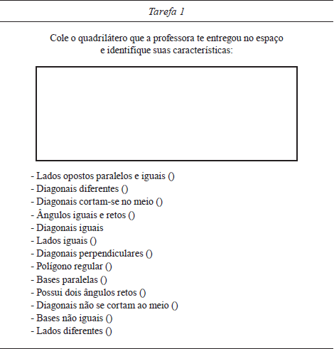 O grupo planejou, conjuntamente, na perspectiva do trabalho colaborativo (Saraiva & Ponte, 2003), duas tarefas de matemática com ênfase em conceitos geométricos, cada qual dividida em duas partes, tomando como referência as habilidades requeridas no documento da BNCC - unidade de geometria. A tarefa 1 contemplava conceitos de geometria plana e visava, na primeira parte da tarefa, identificar e reconhecer figuras planas. Na segunda parte, o objetivo era identificar propriedades dos quadriláteros, cuja habilidade requerida era EF06MA20 - “Identificar características dos quadriláteros, classificá-los em relação a lados e a ângulos e reconhecer a inclusão e a intersecção de classes entre eles” (ME, 2018, p. 303).