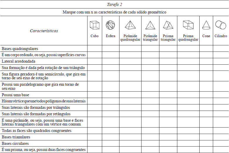Na tarefa 2, conceitos de geometria espacial foram aprofundados, em particular, o trabalho com sólidos geométricos. A proposta de aprendizagem na primeira parte consistia em identificar características dos sólidos geométricos, e a habilidade requerida era: EF04MA17 - “Associar prismas e pirâmides a suas planificações e analisar, nomear e comparar seus atributos, estabelecendo relações entre as representações planas e espaciais” (ME, 2018, p. 293). Na segunda parte, os estudantes se envolveram na montagem dos sólidos, partindo da sua planificação.
