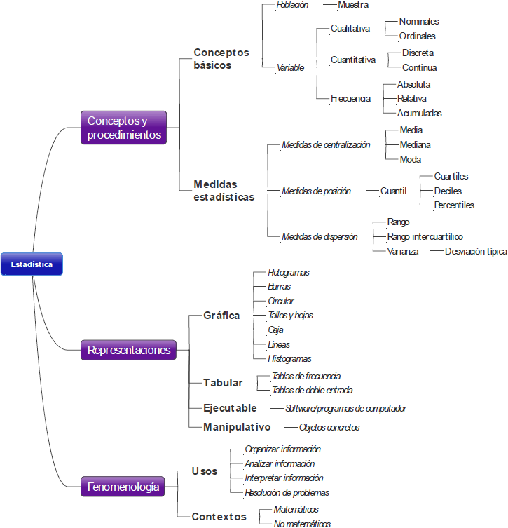 Finalmente, la fenomenología refiere a la organización, análisis e interpretación de información, y el uso de la estadística para la resolución de problemas. Por ejemplo, utilizamos la estadística para (a) organizar, representar y resumir información de conjuntos de datos que tenemos interés en estudiar, (b) describir y analizar información de conjuntos de datos para determinar relaciones o características entre los datos y (c) interpretar los resultados obtenidos con base en un análisis de datos para establecer relaciones con el contexto de la situación. Dentro de la fenomenología consideramos también contextos matemáticos y no matemáticos.