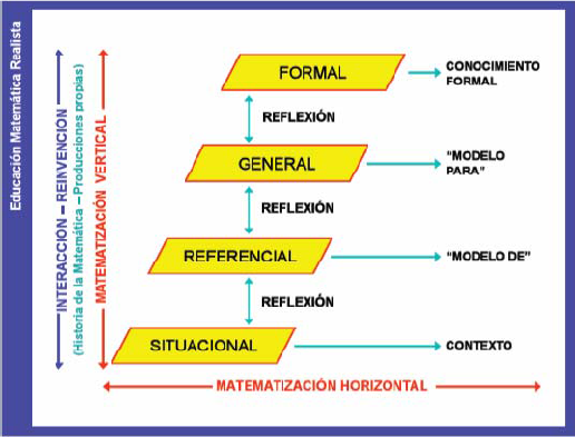 La matematización progresiva en la EMR tiene dos componentes interrelacionados: la matematización horizontal y la vertical. La matematización horizontal se describe como un puente desde el mundo real a las matemáticas formales y simbólicas, en otras palabras, se refiere al proceso de conectar las experiencias y el conocimiento del mundo real con las matemáticas formales. Este proceso implica traducir situaciones de la vida real a un lenguaje y modelos matemáticos, sirviendo como un puente entre el mundo real y el mundo de las matemáticas formales y simbólicas. La matematización horizontal se refiere esencialmente a cómo los estudiantes aplican su conocimiento matemático en contextos prácticos, cómo extraen y formulan problemas a partir de situaciones reales. Este proceso implica identificar los aspectos matemáticos relevantes de una situación real, formular preguntas matemáticas, y usar representaciones matemáticas (como gráficos, tablas o ecuaciones) para analizar y resolver las situaciones.
