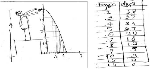Al analizar la tabla de datos, los estudiantes debían reconocer la relación entre el tiempo (t) y la altura (h) del balón, lo que resultó en una variedad de interpretaciones. En esta fase, algunos estudiantes pudieron identificar la naturaleza cuadrática de la relación, es decir, que la altura era proporcional al cuadrado del tiempo transcurrido, un reflejo de la ecuación de movimiento bajo aceleración debida a la gravedad. Sin embargo, se observaron errores comunes en la interpretación de los datos. Algunos estudiantes, por ejemplo, persistieron en el error de la fase anterior y continuaron modelando la relación entre altura y tiempo como lineal, en lugar de cuadrática (ver Figura 2). Esto se evidenció en tablas de datos donde la disminución de la altura no se aceleraba con el tiempo. Otros estudiantes reconocieron la aceleración, pero se confundieron al intentar representarla en sus gráficos, lo que llevó a curvas con la concavidad en la dirección incorrecta o a líneas quebradas que no reflejaban la suavidad de la curva parabólica real. Además, algunos estudiantes lucharon con la interpretación de los datos a nivel más fundamental, como confundir los ejes al asignar la altura al eje horizontal y el tiempo al vertical, o no reconocer la importancia de comenzar el registro del tiempo desde el momento en que el balón comenzaba a caer, lo que introducía errores sistemáticos en sus mediciones. La fase 2 permitió a los estudiantes confrontar y corregir sus concepciones erróneas, utilizando la experimentación y la evidencia para desarrollar una comprensión más precisa del concepto matemático de función y su relación con fenómenos físicos.