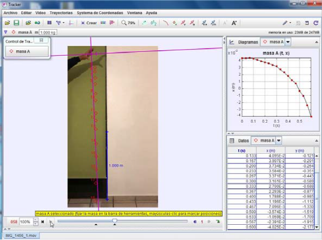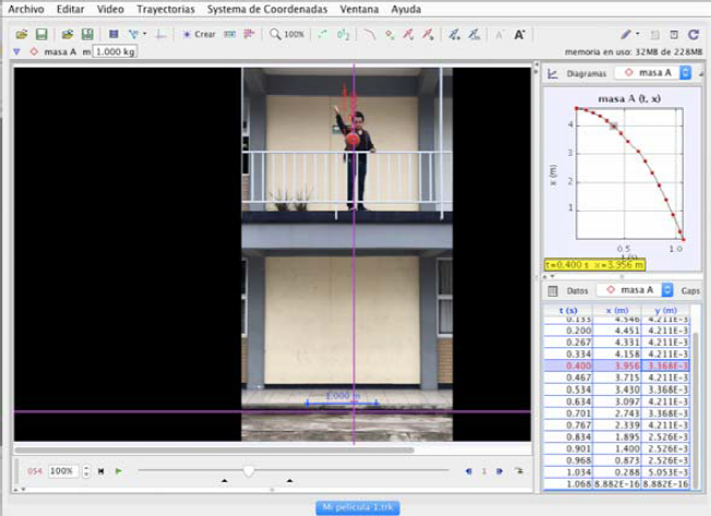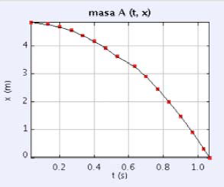 Durante la tercera fase de la secuencia didáctica, los estudiantes repitieron el experimento de caída libre del balón y se adentraron en el uso del software Tracker para analizar el movimiento. Esta fase marcó un avance significativo en el proceso de matematización vertical, donde el enfoque se trasladó hacia la abstracción y la generalización de los modelos matemáticos. Una vez que el Tracker estuvo en uso, los estudiantes pudieron grabar el movimiento del balón con mayor precisión y extraer las coordenadas de posición-tiempo a partir del vídeo (Figura 5). Con esta tecnología comenzaron a visualizar el movimiento del balón en términos de una serie de puntos a lo largo de un eje temporal y espacial, con la posición en el eje vertical y el tiempo en el horizontal. La gráfica resultante mostró, para muchos, una parábola que representaba la aceleración constante debida a la gravedad, un reflejo de la relación cuadrática entre el tiempo y la posición.