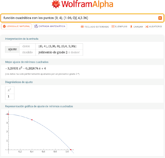 La complejidad del cálculo los abrumó rápidamente, momento en el cual el profesor intervino recomendando el uso de Alpha Wolfram para simplificar la tarea y obtener los coeficientes. Varios meses después de la experimentación de la secuencia didáctica, un estudiante del equipo 6 compartió con el profesor una reflexión sobre cómo habían llegado a la ecuación de su función: utilizaron la plataforma Alpha Wolfram, introduciendo una instrucción directa para que les devolviera la fórmula basada en tres puntos específicos (Figura 8). Su justificación para este procedimiento se apoyó en una discusión previa de una clase donde se comentó que una única parábola puede definirse a través de tres puntos dados no colineales. Esta idea les permitió aplicar la tecnología digital para resolver el problema matemático que se les había presentado. En su momento, este equipo no compartió su procedimiento por temor a que se invalidara su procedimiento o se les sancionara por no usar los procedimientos convencionales.