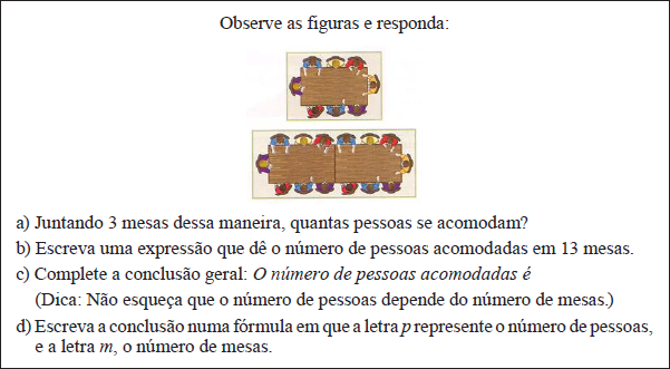 Na plenária, durante a apresentação da discussão da primeira questão, os subgrupos amarelo e vermelho, que estavam com a tarefa das mesas e cadeiras (Figura 2), encontraram as expressões numéricas: p = 6m + 2 e (13m x 6p) + 2 = 80.
