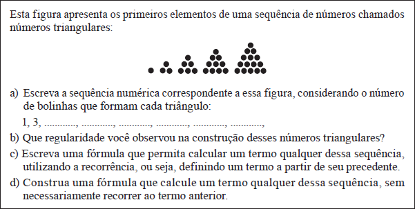 No que se refere ao conhecimento matemático, as três tarefas matemáticas, expostas nas Figuras 2, 3 e 4, ainda que considerem conteúdos específicos de cada série/ano, focam na análise do comportamento de padrões, buscando expressões algébricas, além de possuir figuras e representações que contribuem para a abstração. As questões colocadas abaixo de cada “tipo de padrão” nas referidas figuras, são designadas como questões abertas, uma vez que cada professor pode chegar ao resultado por uma diversidade de resoluções e representações. Além disso, é possível constatar que se trata de tarefas matemáticas de alto nível cognitivo, pois exploram a natureza dos conceitos, relações e processos matemáticos, como na questão b da segunda tarefa: Que regularidade você observou na construção desses números triangulares?