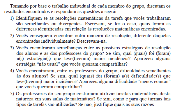 Estas questões fomentam a discussão nos subgrupos, levando os professores a compartilhar o que haviam respondido individualmente e destacam o conhecimento acerca das possíveis estratégias e dificuldades que os alunos da educação básica teriam na resolução da tarefa matemática. Além disso, buscam comparar as resoluções dos professores e as dos alunos: Vocês encontraram semelhanças...