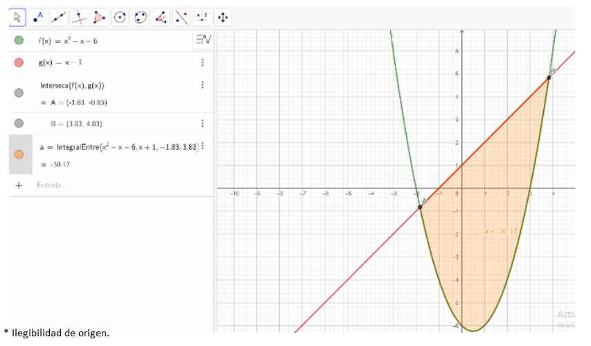 Estimación del área entre dos curvas para la función y , en el intervalo de intersección de sus curvas, asistido por GeoGebra.