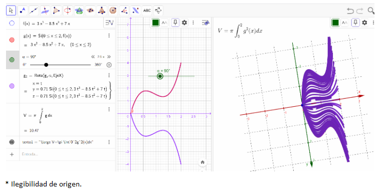 Representar el sólido de revolución, punto a punto y estimar el volumen usando GeoGebra 3D, para la integral definida: