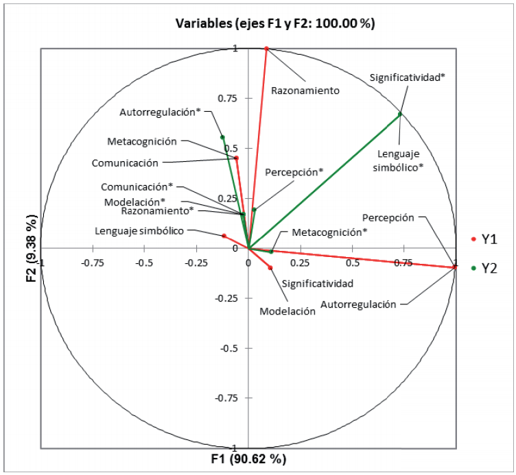 En la Figura 6 se representan de forma gráfica los resultados de los coeficientes canónicos estandarizados, en el primer cuadrante se muestran las dimensiones metacognición*, percepción*, significatividad* y lenguaje simbólico* como las dimensiones más importantes del estudio. El mejor valor de adecuación en ambas variables lo muestra la variable canónica F1 con un valor de (0.254) en la Tabla VII.