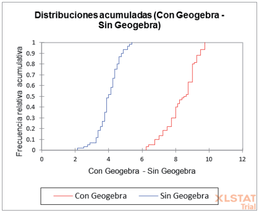 Finalmente, se aplicó una prueba de Kolmogorov-Smirnov entre las medias de las dimensiones antes y después de modelar las propuestas de trabajo matemático con GeoGebra, para comparar el valor-p computado con el nivel de significación alpha, de esta manera podemos asumir cuál de las hipótesis soporta la investigación. Si “p” es mayor que “alpha” se acepta la hipótesis nula, en caso contrario se rechaza. Entonces, se contrasta la hipótesis de normalidad de la población, el estadístico de prueba es la máxima diferencia de:
