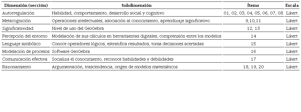 El pensamiento matemático se caracteriza por su dinamismo, claridad, progreso y simplicidad, desempeñando un rol fundamental en el aprendizaje (Reyes-Santander et al., 2018). Según Blossier y Richard (2014), este tipo de pensamiento está estrechamente relacionado con el uso de herramientas informáticas y el desarrollo de habilidades específicas en la interacción con dichas herramientas. Basándonos en esta premisa, se considera que el pensamiento matemático y espacial deben reforzar los conocimientos adquiridos en matemáticas. Para este estudio, se diseñaron encuestas centradas en las dimensiones del pensamiento matemático propuestas por Ocaña Gómez et al. (2019). Estas encuestas abarcaron ocho dimensiones y veinte subdimensiones, utilizando una escala Likert de 1 a 10, donde 1 representa el valor más bajo y 10 el más alto (ver Tabla I).