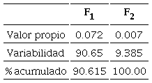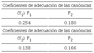 Este es el resultado final la investigación, donde se muestran los coeficientes de adecuación del estudio, la variable canónica más representativa es (F1=0.254) (Tabla VIII).