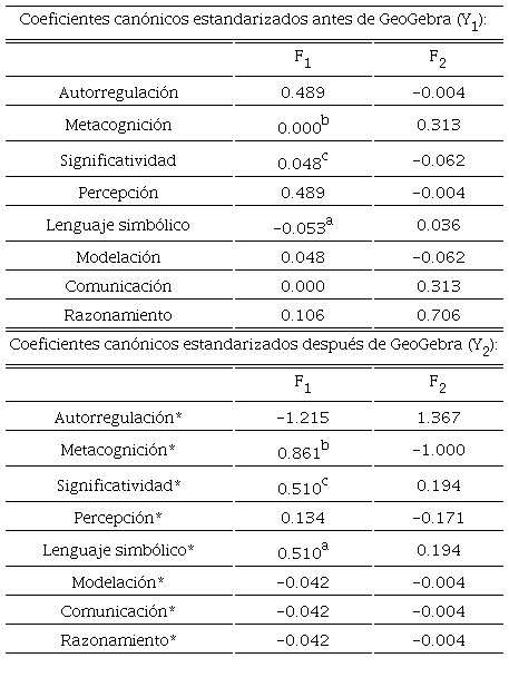 Estos son los resultados que definieron el estudio, los coeficientes canónicos estandarizados (ver Tabla VI). A partir de aquí se definieron las combinaciones lineales de cada una de las dos variables canónicas que resultaron ser significativas. La dimensión lenguaje simbólico después de aplicar GeoGebra mejoró (0.510a), sabiendo que antes del software era menor (-0.053a) implica que su correlación es proporcional inversa, esta dimensión está vinculada con la variable canónica.