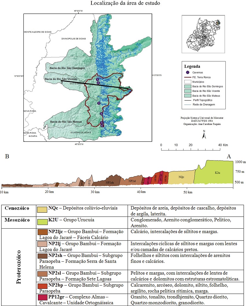 A área de estudo está localizada no município de São Domingos, no nordeste do estado de Goiás, exclusivamente compreendendo as bacias hidrográficas do médio e alto curso dos rios São Domingos, São Vicente e São Mateus, nas quais está inserido o Parque Estadual Terra Ronca (PETeR). Tal escolha justifica-se pelas sub-bacias do médio e alto curso dos referidos rios estarem a montante do sistema cárstico, contribuindo potencialmente com sedimentos às cavernas do PETeR.