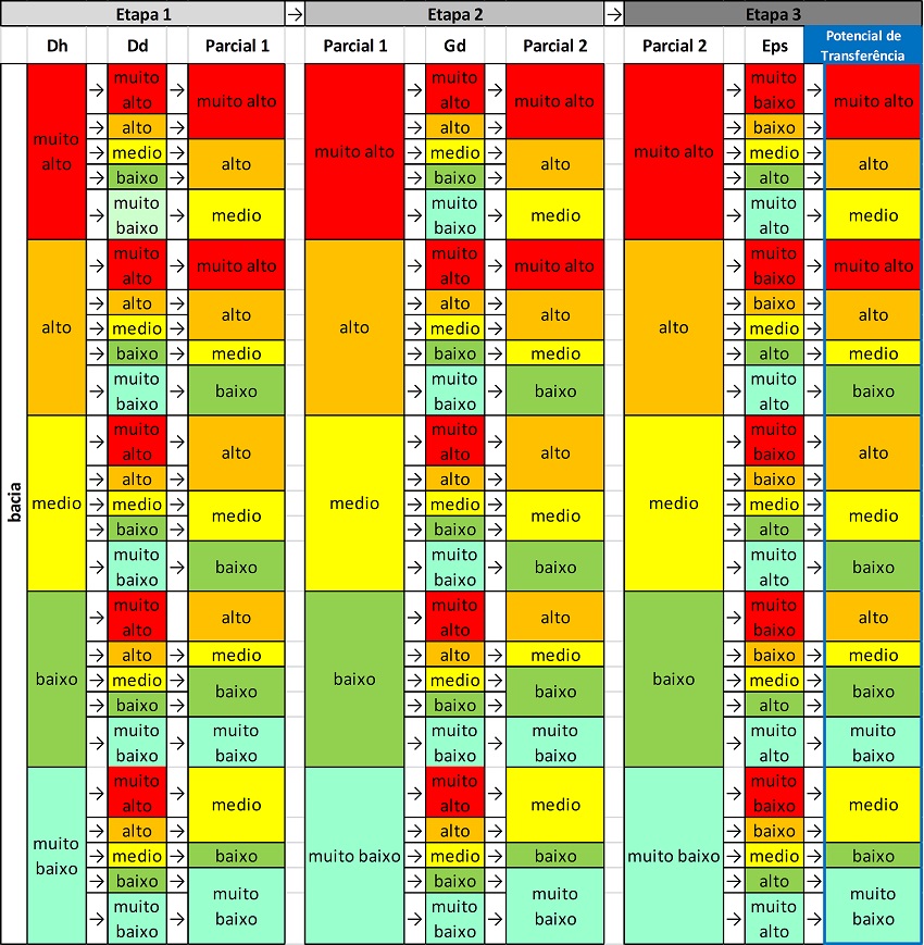 Os parâmetros foram associados dois a dois, seguindo três etapas (Figura 2): na etapa 1, associou-se os parâmetros Dh e Dd, determinando-se um potencial parcial (parcial 1); na etapa 2, o potencial parcial 1 associou-se ao Gd, produzindo o potencial parcial 2; na etapa 3, associou-se o potencial parcial 2 ao Eps, determinando o Potencial de Transferência de Sedimentos final.